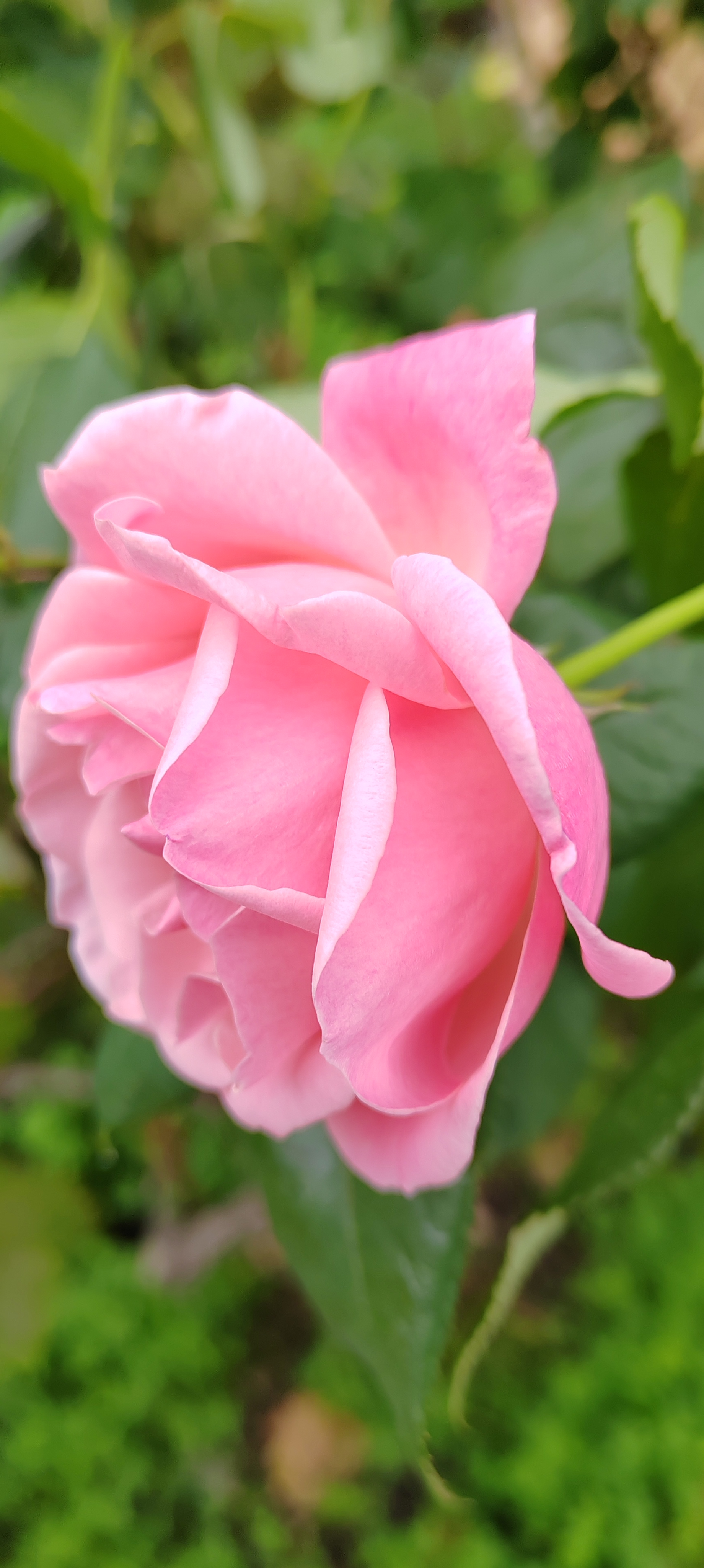 Scarica gratuitamente questa magnifica immagine di rosa rosa a fioritura parziale, un simbolo di grazia ed eleganza. La fotografia cattura la morbidezza dei petali con una tonalità di rosa cipria delicata e romantica, evidenziando le curve e la struttura interna del fiore.